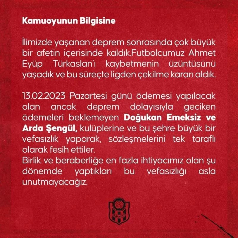 Yeni Malatyaspor, Doğukan Emeksiz ve Arda Şengül’ün deprem nedeniyle ödemelerinin gecikmesinden dolayı sözleşmelerini tek taraflı feshettiğini açıkladı. Malatyaspor oyunculara, "Bu vefasızlığı asla unutmayacağız" diyerek tepki gösterdi.