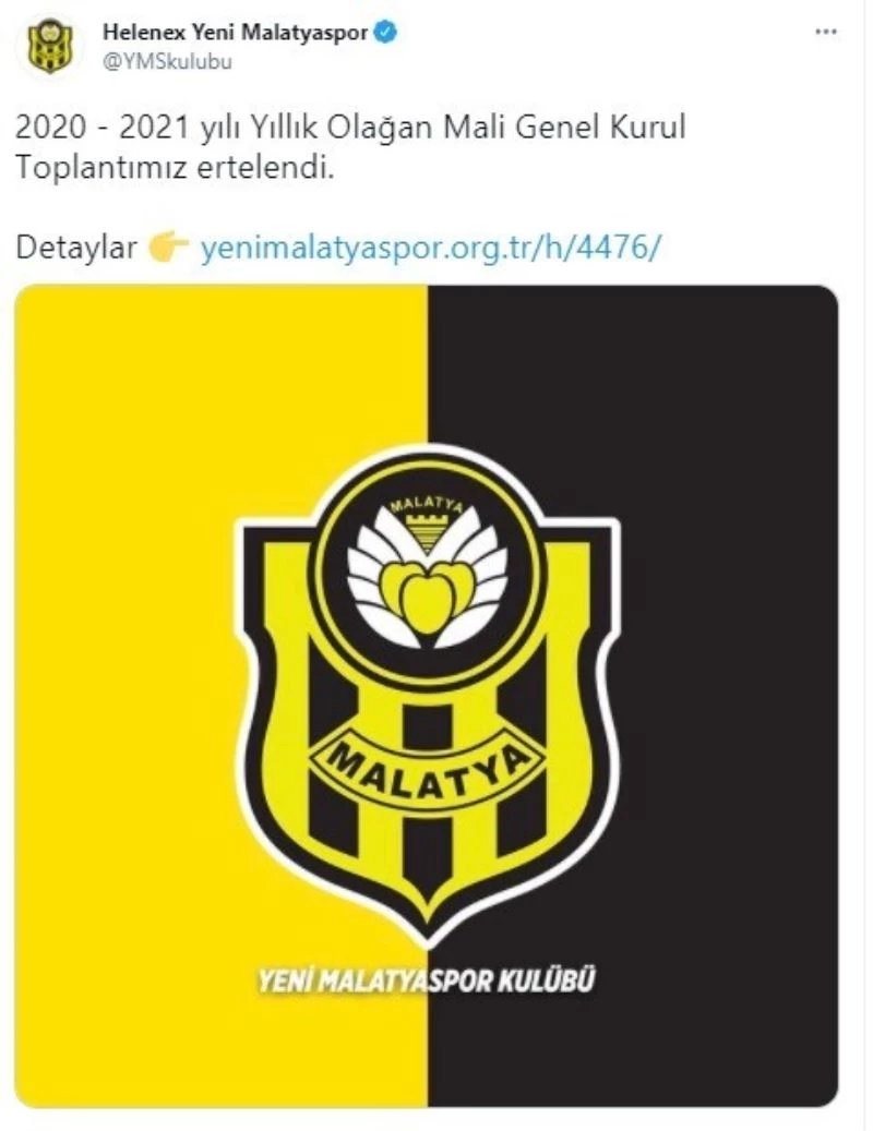 Yeni Malatyaspor, kulübünden konu ile ilgili yapılan açıklamada, “Yıllık Olağan Mali Genel Kurul Toplantımız ertelendi. Bugün Nurettin Soykan Tesisleri Altyapı Toplantı Salonunda gerçekleştirilmesi planlanan 2020-2021 yılı yıllık Olağan Mali Genel Kurul Toplantımız yeterli çoğunluğun sağlanamaması sebebiyle ertelenmiştir. Kongremiz, 12 Haziran Cumartesi günü saat 10.00’da çoğunluk aranmaksızın Battalgazi Belediyesi Konferans Salonunda yapılacaktır. Kamuoyuna saygıyla duyurulur” ifadelerine yer verildi.