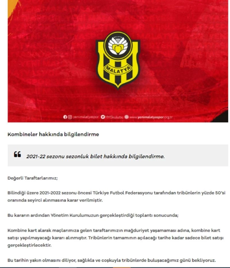 bilindiği üzere 2021-2022 sezonu öncesi Türkiye Futbol Federasyonu tarafından tribünlerin yüzde 50’si oranında seyirci alınmasına karar verilmiştir. Bu kararın ardından Yönetim Kurulumuzun gerçekleştirdiği toplantı sonucunda; kombine kart alarak maçlarımıza gelen taraftarımızın mağduriyet yaşamaması adına, kombine kart satışı yapılmayacağı kararı alınmıştır. Tribünlerin tamamının açılacağı tarihe kadar sadece bilet satışı gerçekleştirilecektir. Bu tarihin yakın olmasını diliyor, sağlıkla ve coşkuyla tribünlerde buluşacağımız günü bekliyoruz” ifadelerine yer verildi.