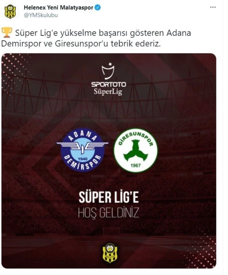 Yeni Malatyaspor’un sosyal medya üzerinden yayınladığı mesajda, “Süper Lig’e yükselme başarısı gösteren Adana Demirspor ve Giresunspor’u tebrik ederiz” ifadelerine yer verildi.