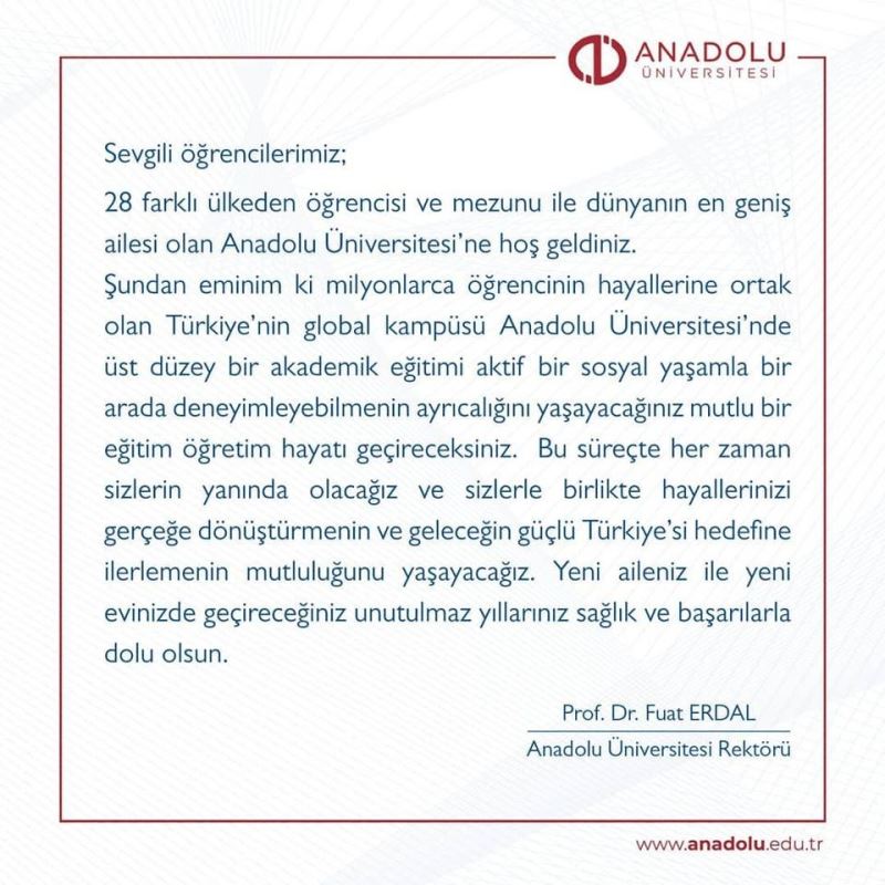 “Sevgili öğrencilerimiz; 28 farklı ülkeden öğrencisi ve mezunu ile dünyanın en geniş ailesi olan Anadolu Üniversitesi’ne hoş geldiniz. Şundan eminim ki milyonlarca öğrencinin hayallerine ortak olan Türkiye’nin global kampüsü Anadolu Üniversitesi’ne üst düzey bir akademik eğitimi, aktif bir sosyal yaşamla bir arada deneyimleyebilmenin ayrıcalığını yaşayacağınız, mutlu bir eğitim öğretim hayatı geçireceksiniz. Yeni ailenizle yeni evinizde geçireceğiniz unutulmaz yıllarınız sağlık ve başarılarla dolu olsun”.