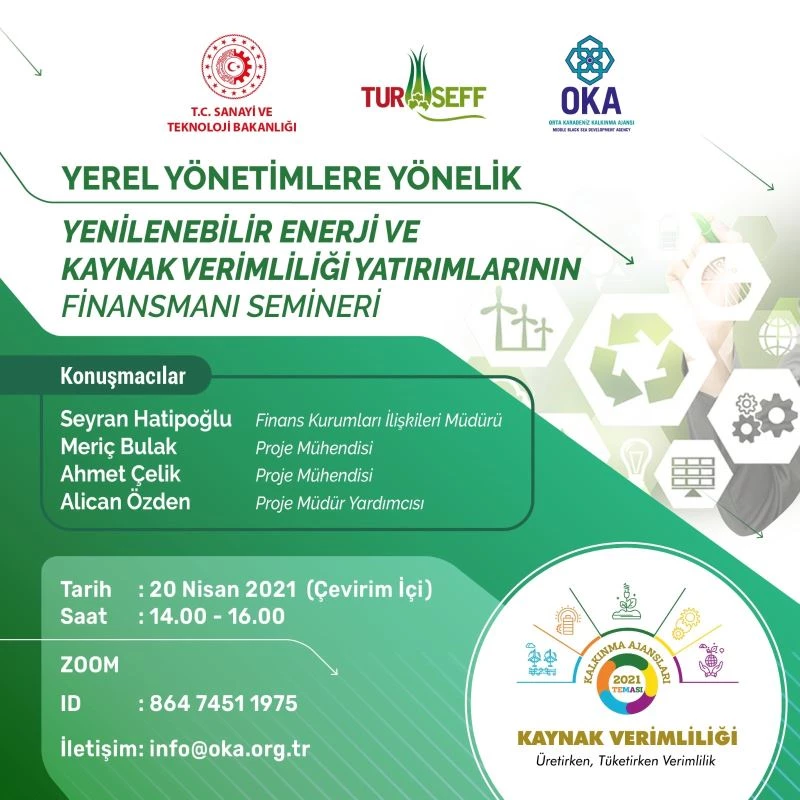 Bu amaçla, ‘Türkiye Sürdürülebilir Enerji Finansman Programı (TurSEFF)’ ile OKA arasında, 2021 yılı içerisinde ortak faaliyetler yürütülecektir. TurSEFF, kamu ve özel sektör tarafından uygulanacak ‘Sürdürülebilir Enerji ve Kaynak Verimliliği’ yatırımları için finansman sağlamak üzere oluşturulmuş bir programdır. Program Avrupa İmar ve Kalkınma Bankası (EBRD) tarafından geliştirilmiş olup 2010 yılından bu yana Avrupa Birliği (AB) tarafından desteklenmektedir. Hibe desteğin yer almadığı program kapsamında yatırımcılar, uygunluk kriterlerini taşıyan söz konusu alanlardaki yatırım projeleri için anlaşmalı finansal kurumların kredi veya leasing araçlarına başvuru yapabilmektedir. Yerli ve yabancı uzmanlardan oluşan bir ekip, yatırımcıların projelerini belirlemelerine ve geliştirmelerine yardımcı olmakta ve onlara başarılı başvurular hazırlamaları için destek sağlamaktadır. Sağlanan bu teknik destek ücretsiz olup Avrupa Birliği tarafından finanse edilmektedir. Konuyla ilgili; Orta Karadeniz Bölgesi’nde yer alan yerel yönetimlerin idari ekipleri, fen işleri, çevre, ulaşım, su ve kanalizasyon birimleri ile proje, finans birimi çalışanlarına, OSB Müdürlüklerinin idari ekip ve personellerine ve KOBİ’lerin yetkililerine yönelik olmak üzere, ‘Yenilenebilir Enerji ve Kaynak Verimliliği Yatırımlarının Finansmanı Seminerleri’ planlanmıştır.”