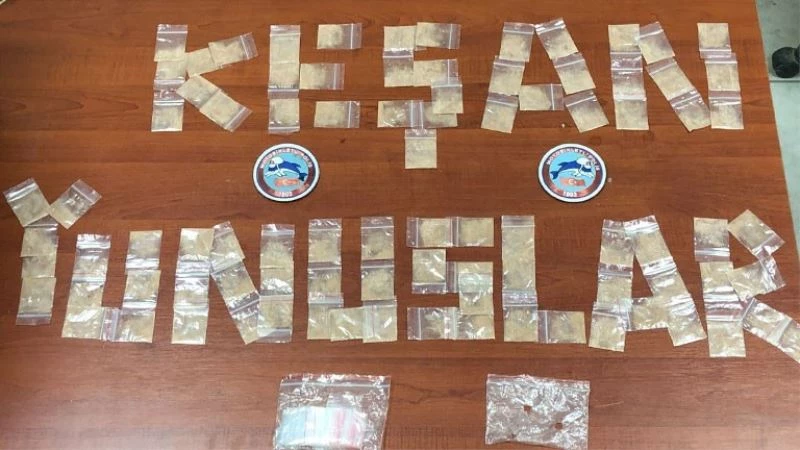 Keşan’da devriye görevini sürdüren motosikletli polis timleri, Yeni Mescit Mahallesi’nde bir sokak üzerinde gördükleri M.D. ve H.B. isimli iki şahsın durumundan şüphelenerek izlemeye aldı. Şahıslardan birinin uyuşturucu olabileceği düşündükleri maddeyi yere attığını gören yunuslar, yere atılanın 0.73 gram eroin olduğunu tespit etti.
