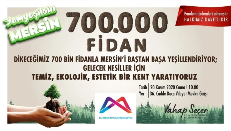 Büyükşehir Belediyesinden yapılan açıklamaya göre, Park ve Bahçeler Dairesi Başkanlığı daha yeşil bir Mersin için önemli bir adım atarak, ’Yeşil Mersin’ projesini başlatıyor. 13 ilçenin tamamında eş zamanlı olarak 20 Kasım Cuma günü saat 10.00’da başlatılacak olan kampanya için ilk fidanı Mersin Büyükşehir Belediye Başkanı Vahap Seçer dikecek.