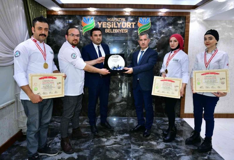 Yeşilyurt Belediye standında hem yöresel yemeklerin tanıtımını yapan hem de düzenlenen yarışmadan Türkiye birinciliği ile ayrılan şef ve yemek ustaları, Yeşilyurt İŞGEM Genel Müdürü Numan Özcan ile birlikte Yeşilyurt Belediye Başkanı Mehmet Çınar’ı makamında ziyaret ettiler.