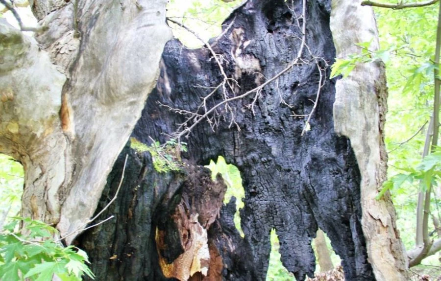 Kahramanmaraş'taki Cödden Vadisi’nde yıldırım düşmesi sonucu içi yanan 600 yıllık çınar ağacı yıllara meydan okuyor.