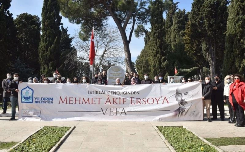 Yıldırım Belediyesi, İstiklal Marşı’nın kabulünün 100. yıldönümü münasebetiyle Vatan Şairi Mehmet Akif Ersoy’u anmak hedefiyle iki ayrı program gerçekleştirdi. Programın ilki “İstiklal Gençliğinden Mehmet Akif’e Vefa” teması ile Edirnekapı Şehitliği’nde Mehmet Akif Ersoy’un kabri başında düzenlendi. Emir Sultan Cami önünden dua edilerek İstanbul’a uğurlanan ekip, Yıldırım Belediyesi’nin düzenlemiş olduğu programa iştirak etti. Edirnekapı Şehitliği’nde yapılan program, İstanbul Yazarlar Birliği Başkanı Mahmut Bıyıklı’nın konuşması ile başladı. Yıldırımlı gençlere Akif’in Asım’ını anlatarak bu idealin nasıl gerçekleşeceğini aktaran Mahmut Bıyıklı, “Bu anlamlı ve tarihi bir günde sizlerle birlikte olmak, Akif ile birlikte olmak, Akif’in ziyaretçisi olmak büyük bir şeref. Türkiye’nin yeniden ‘Büyük Türkiye’ ideali ile geleceğe taşınması ve bu noktada yeni nesillere bir ruh aşısında bulunmak istiyorsak İstiklal Marşı’nı anlamak ve manasına derin bir yolculuk yapmak zorundayız. 100’üncü yıl bize büyük bir imkan sunuyor. Bu imkanı da değerlendiren Yıldırım Belediyesi’ne teşekkür ediyoruz. İnşallah yeniden bir dirilişin, yeniden bir toparlanışın merkezi buradan olacak. Akif hala bu toplumda yaşamaya hala bu topluma nefes olmaya, şifa sunmaya ve önerilerde bulunmaya devam ediyor. Bizim Akif’in Asım’ı olma idealini önce kendi içimizde sonra çevremizde yaşatmamız gerekmektedir" dedi.