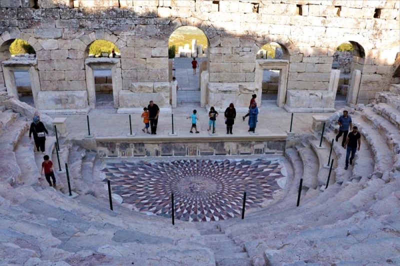 Milattan sonra 1. yüzyilin ilk evrelerinde "Opus Sectile" teknigiyle renkli mermerlerden insa edilen mitolojide "Gözlerine bakan kötü niyetli kisileri tasa çevirdigine" inanilan Medusa'yi tasvir eden mozaigin dünyada benzerinin bulunmadigi belirtiliyor. Antik dönemde konser alani, meclis, mahkeme ve üzeri kapali tiyatro görevi yapan odeonunun ortasindaki Medusa mozaigi, ihtisamiyla normallesme döneminde de ziyaretçilerden ilgi görüyor.