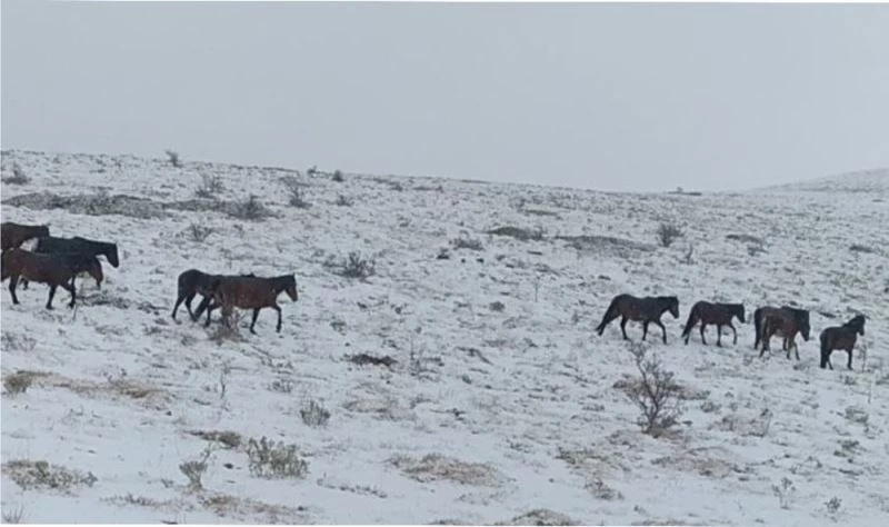 Yılkı atlarını gören ekipler cep telefonu ile atları görüntüledi. Görüntüde atların sürüler halinde ve kar altında dolaştıkları görülüyor.