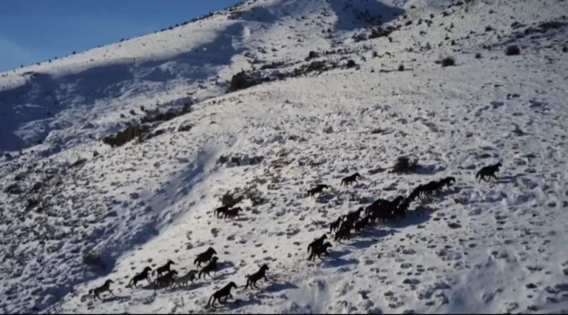 Afyonkarahisar’ın Şuhut ilçesine bağlı Balçıkhisar köyü sınırlarındaki 1800 rakımlı Kumalar Kale mevkiinde yılkı atları, doğal yaşam alanlarında drone ile havadan görüntülendi.