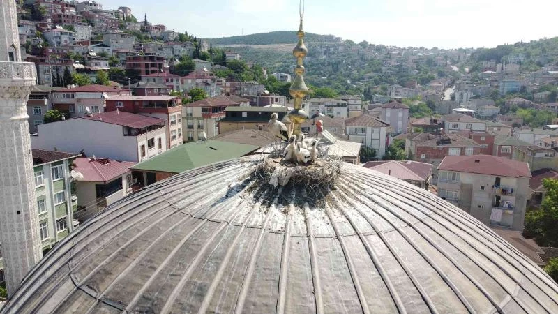 Kocaeli’de bir caminin kubbesine yuva yapan anne leylek ve yavruları ilçede yaşayan vatandaşların ilgi odağı oldu.
