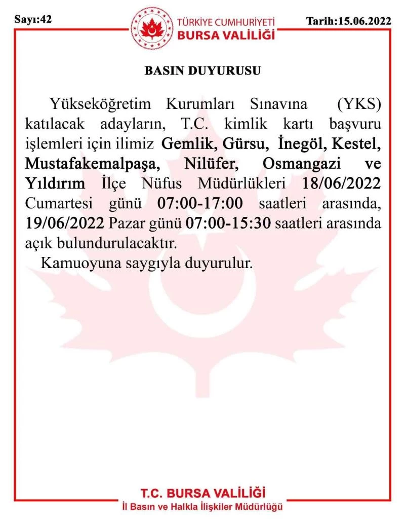 Bursa Valiliğinden yapılan açıklamada, "Yükseköğretim Kurumları Sınavına (YKS) katılacak adayların, T.C. kimlik kartı başvuru işlemleri için ilimiz Gemlik, Gürsu, İnegöl, Kestel, Mustafakemalpaşa, Nilüfer, Osmangazi ve Yıldırım İlçe Nüfus Müdürlükleri 18/06/2022 Cumartesi günü 07.00-17.00 saatleri arasında, 19/06/2022 Pazar günü 07.00-15.30 saatleri arasında açık bulundurulacaktır. Kamuoyuna saygıyla duyurulur" ifadelerine yer verildi.
