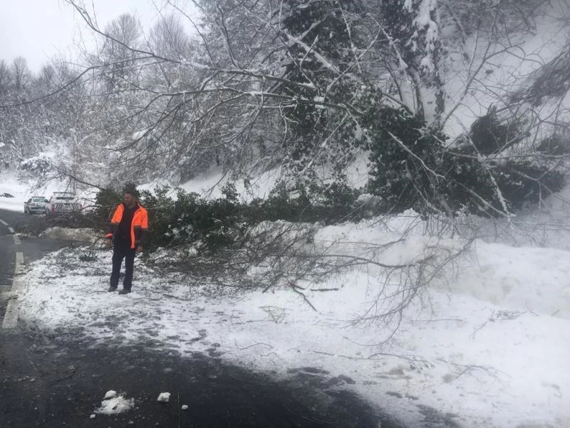 Düzce’de etkili olan yoğun kar yağışı nedeniyle D-655 Karayolu’na ağaç devrildi. Ekiplerin yoğun çalışması ile ağaç kısa sürede karayolundan kaldırıldı.