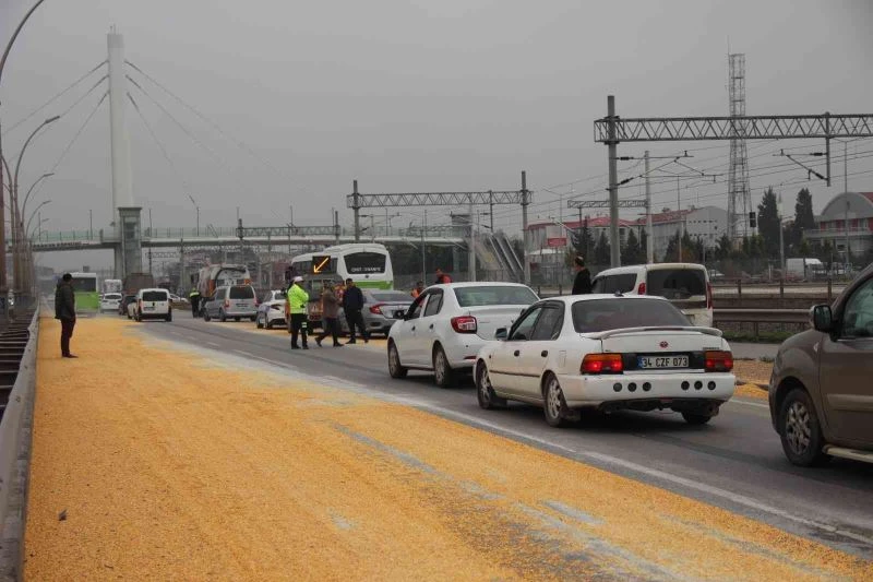 Kocaeli’nin İzmit ilçesinde seyir halindeki mısır yüklü kamyonun kapağı açılınca mısırlar yola döküldü.