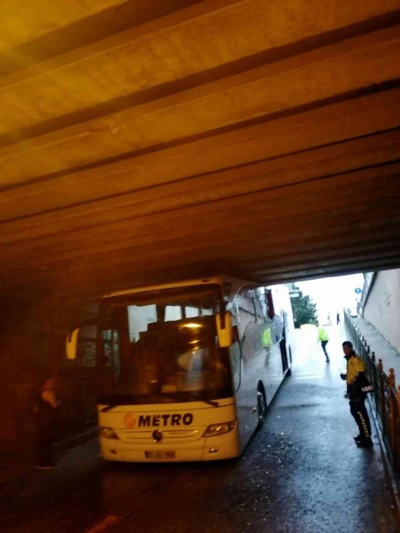 Denizli’den Sakarya’ya gelen yolcu otobüsü Arifiye ilçesinde bulunan 3 metre yükseklikteki alt geçitte sıkıştı. Yolcular tahliye edilirken, otobüs uzun uğraşlar neticesinde sıkıştığı yerden çıkartıldı.