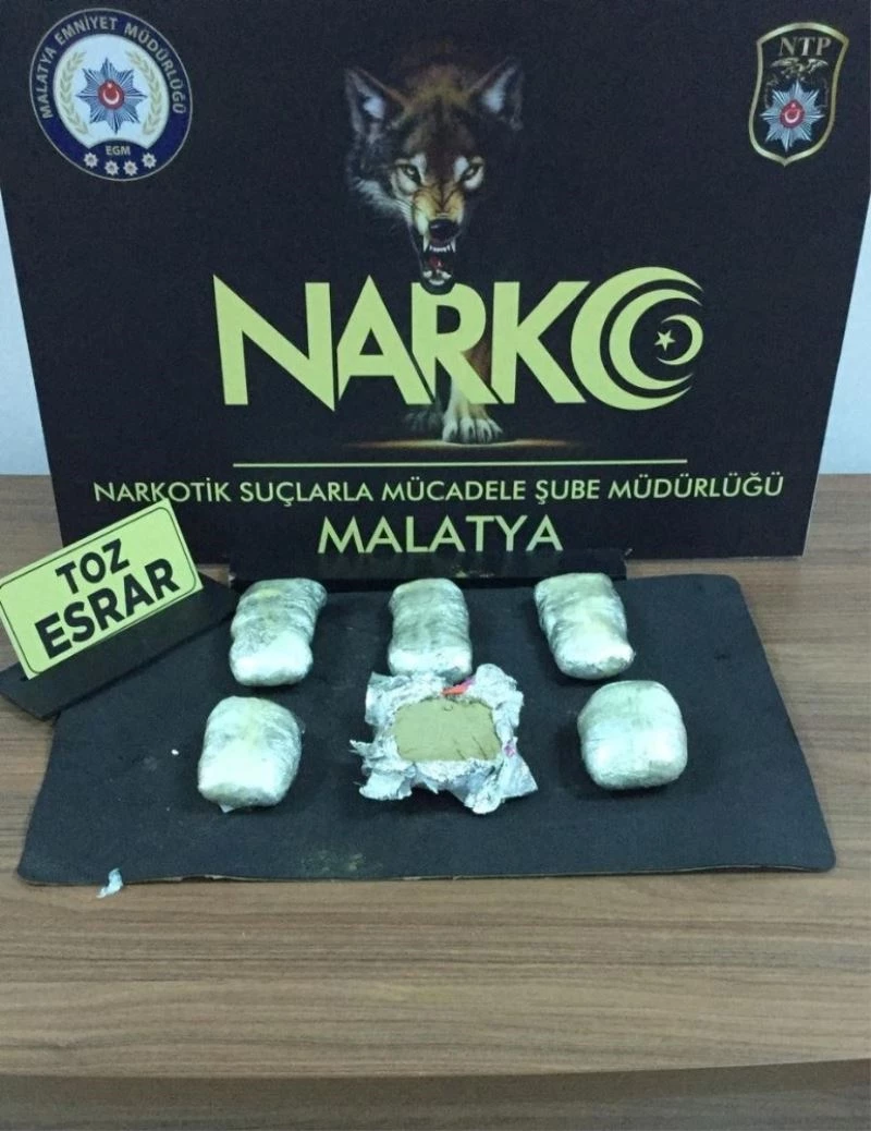 Edinilen bilgiye göre, Malatya Emniyet Müdürlüğü Narkotik Suçlarla Mücadele Şube Müdürlüğü görevlilerince şehirlerarası otobüs terminalinde otobüsler üzerinde arama yapıldı. Çalışmalarda batı illerine giden bir yolcu otobüsünde yapılan aramada, 1 kilo 85 gram toz esrar maddesi ele geçirildi.