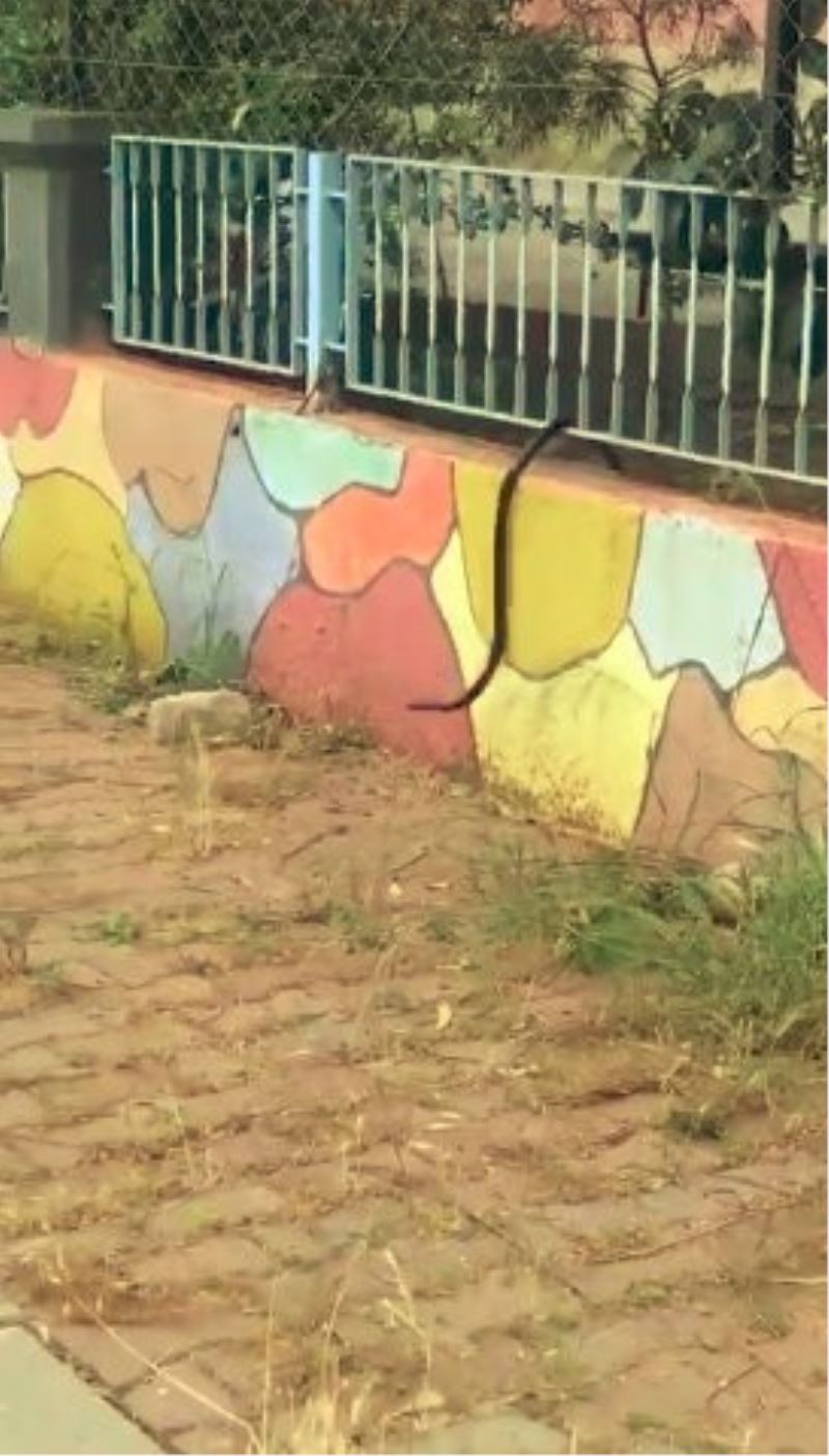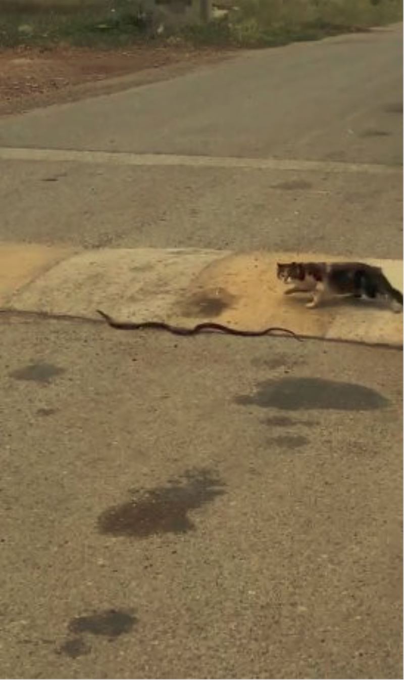 Döşemealtı ilçesinde bir kedi, yolun karşısına doğru yavaş yavaş ilerleyen yılan gördü. Kedi yılana yaklaşıp patilerini uzattı. Bir iki hamle yapan kedi, daha sonra yılanı ağzıyla yakalayıp yakındaki bir demir korkuluklu duvardan atladı. Kedi duvardan geçerken yılan demire takılı kaldı. Yılan hemen demirden getirildiği yöne doğru yere indi ve duvarın dibine saklandı. Kedi ise geri gelip yılanı önce yukarından izledi daha sonra üzerine atladı. Bir taşın yakınına sığınan yılan daha sonra gözlerden kayboldu.