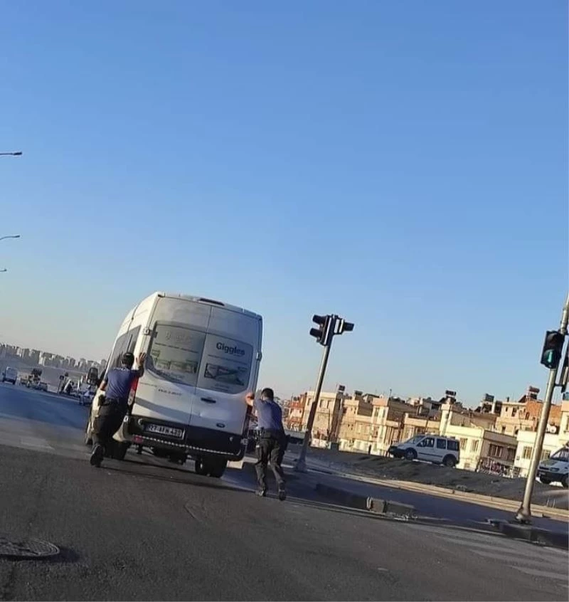 Gaziantep’te seyir halinde bulunan bir minibüs arıza yapınca yolda kaldı. Sürücüsünün bir türlü çalıştıramadığı minibüsün yardımına bölgede bulunan polisler yetişti. Polislerin bir süre ittiği minibüs yeniden çalışarak yoluna devam etti.