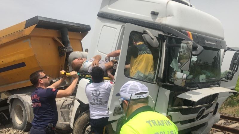 Manisa’da direksiyon hakimiyetini kaybederek karşı şeride geçen hafriyat kamyonu tren raylarının üzerine çıktı. Kazada kamyon şoförü yaralı olarak hastaneye kaldırıldı.