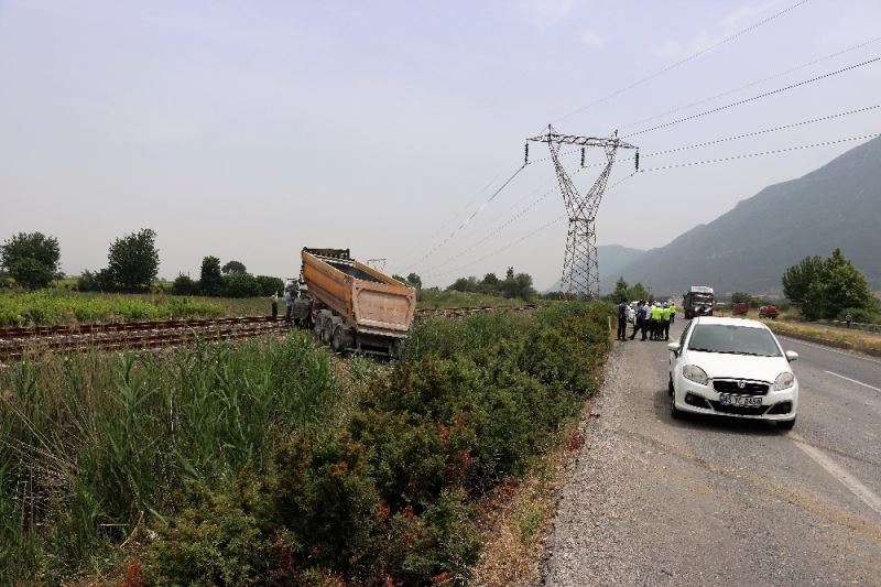 Yoldan çıkan hafriyat kamyonu tren raylarında durdu