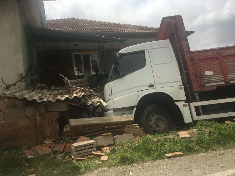 Denizli’nin Çivril ilçesinde meydana gelen kazada, yoldan çıkan kamyon eve çarparak durabildi.