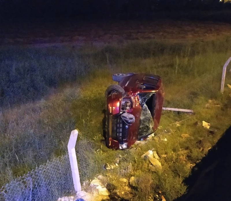 Yoldan çıkan otomobil tarladaki tellere takılarak durabildi