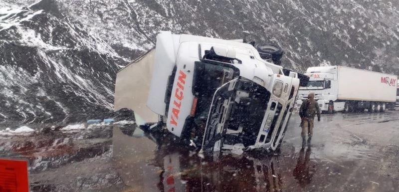 Yüksekova karayolunda yoğun kar yağışı nedeniyle kayganlaşan yoldan çıkan tır devrildi.