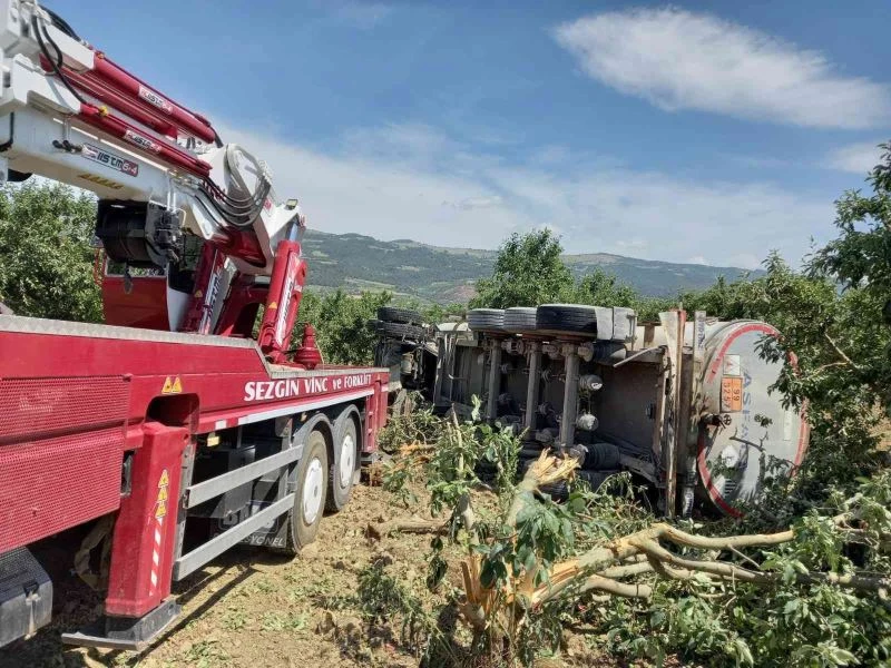 Yoldan çıkan tır meyve bahçesine devrildi, sürücü hayatını kaybetti