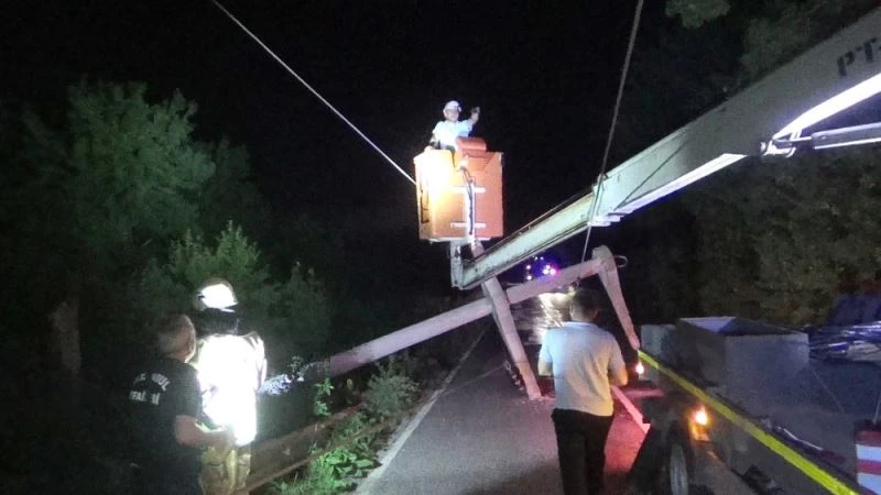 Ekipler elektrik direğini yoldan kaldırmak için hat üzerindeki elektrikleri keserek çalışma başlattı.