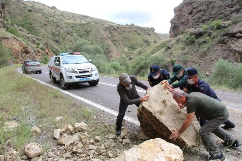 Erzurum’un Şenkaya ilçesinde Gaziler mahallesi yolu üzerinde yola düşen kaya parçaları jandarma ve vatandaşlar tarafından temizlendi.