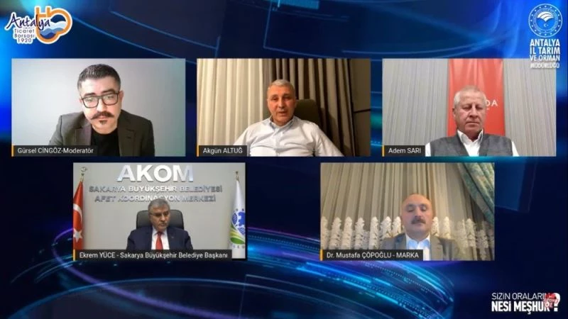 Antalya Ticaret Borsası ile Antalya Tarım ve Orman Müdürlüğü işbirliğiyle düzenlenen “Sizin Oraların Nesi Meşhur?” programında Sakarya’nın yöresel ürünleri ve coğrafi işaretli ürünleri konuşuldu. Gürsel Cingöz moderatörlüğünde online düzenlenen programın bu haftaki konukları, Sakarya Büyükşehir Belediye Bakanı Ekrem Yüce, Sakarya Ticaret ve Sanayi Odası Yönetim Kurulu Başkanı Akgün Altuğ, Sakarya Ticaret Borsası Yönetim Kurulu Başkanı Adem Sarı, Doğu Marmara Kalkınma Ajansı Genel Sekreteri Dr. Mustafa Çöpoğlu oldu.