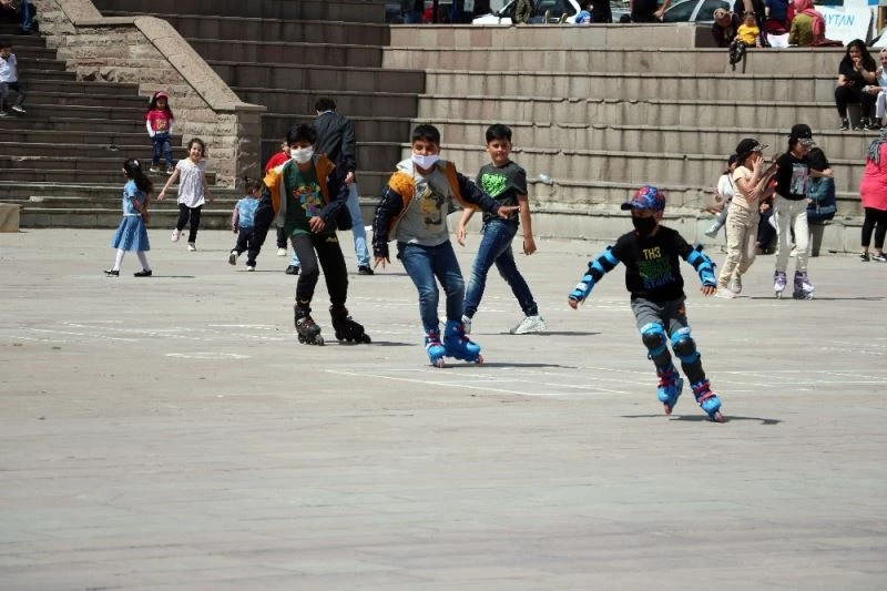 Yozgat Cumhuriyet Meydanı’nı dolduran çocukların kimi paten kaydı, kimi bisiklete bindi kimi de top oynayarak izinlerinin tadını çıkardı. Oyundan yorulan bazı çocuklar ise dedelerinin dizine yatarak yorgunluklarını giderdi.