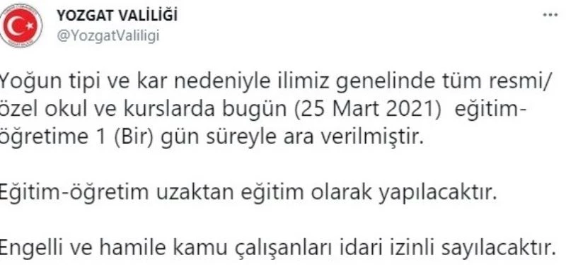 Yozgat Valiliği, sosyal medya üzerinden yaptığı paylaşımda “Yoğun tipi ve kar nedeniyle ilimiz genelinde tüm resmi/ özel okul ve kurslarda bugün (25 Mart 2021) eğitim-öğretime 1 (Bir) gün süreyle ara verilmiştir. Eğitim-öğretim uzaktan eğitim olarak yapılacaktır. Engelli ve hamile kamu çalışanları idari izinli sayılacaktır” ifadelerine yer verdi.