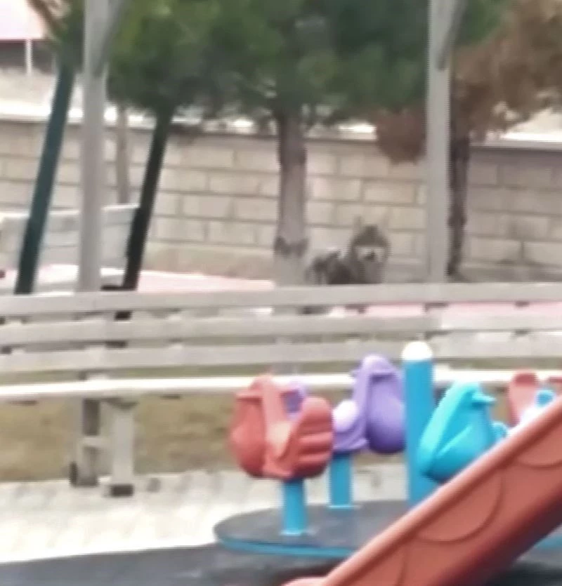 Yozgat’ın Sarıkaya ilçesinde yiyecek bulmak için yerleşim alanına inen kurt, bir oyun parkında görüntülendi.