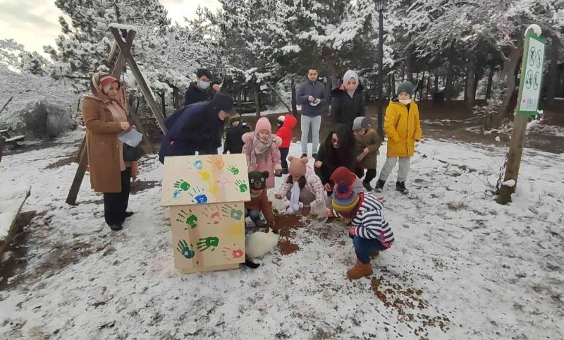 Yozgat’ta kreş öğrencileri, kış aylarında barınma ve yem bulmakta güçlük çeken sokak hayvanları için doğaya yuva ve yem bıraktı.