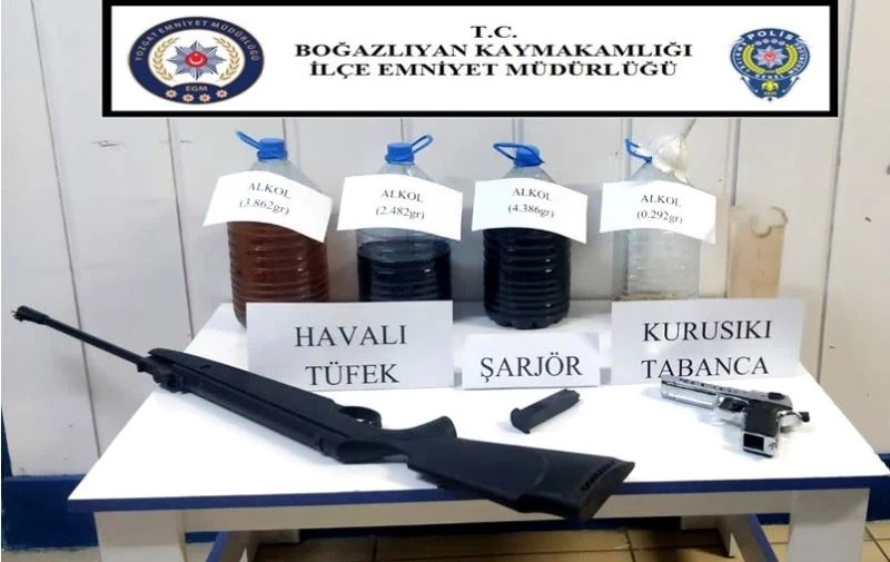 Yozgat’ın Boğazlıyan ilçesinde bir tekel bayiinde sahte alkol satışı yapıldığı bilgisini alan İlçe Emniyet Müdürlüğü ekipleri, Boğazlıyan Cumhuriyet Başsavcılığı koordinesinde çalışma başlattı. İş yerine baskın düzenleyen emniyet ekipleri, 4 bidon içerisinde yaklaşık 15 litre el yapımı şarap ele geçirdi. Yapılan aramada 1 adet kurusıkı tabanca ve tüfeğe de el konuldu. Olayla ilgili gözaltına alınan Ş.K. ve N.K., emniyetteki işlemlerinin ardından adliyeye sevk edildi.