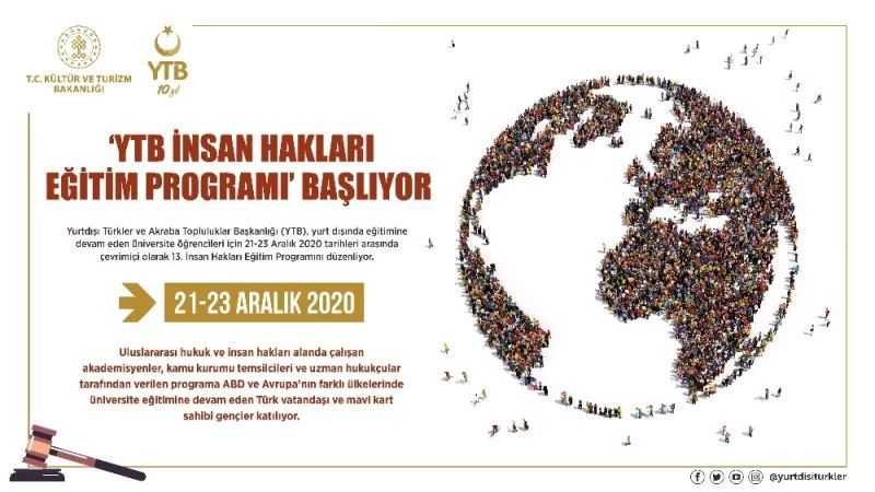 Yurtdışı Türkler ve Akraba Topluluklar Başkanlığı (YTB), yurt dışında eğitimine devam eden üniversite öğrencileri için 21-23 Aralık 2020 tarihleri arasında çevrimiçi olarak "İnsan Hakları Eğitim Programı" düzenleyecek.