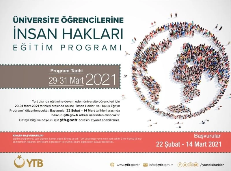 Yurtdışı Türkler ve Akraba Topluluklar Başkanlığı, yurt dışında eğitimlerine devam eden Türk vatandaşı ve mavi kart sahibi gençler için çevrim içi olarak "İnsan Hakları Online Eğitim Programı" düzenliyor. 29-31 Mart tarihleri arasında düzenlenecek olan program sayesinde yurt dışında yaşayan gençler insan hakları, ayrımcılık, nefret suçları, Avrupa İnsan Hakları Mahkemesi ve ilgili uluslararası kuruluşların yapısı ile işleyişi gibi konularda teorik eğitimler alacaklar. Bunun yanında eğitimlerde akademisyenler, kamu kurum temsilcileri ve alanda çalışan uzman hukukçular tarafından sivil savunuculukla ilgili tecrübe paylaşımları yapılacak. Program dili Türkçe olacak olan eğitimlerin sonunda da katılımcılara sertifika verilecek.