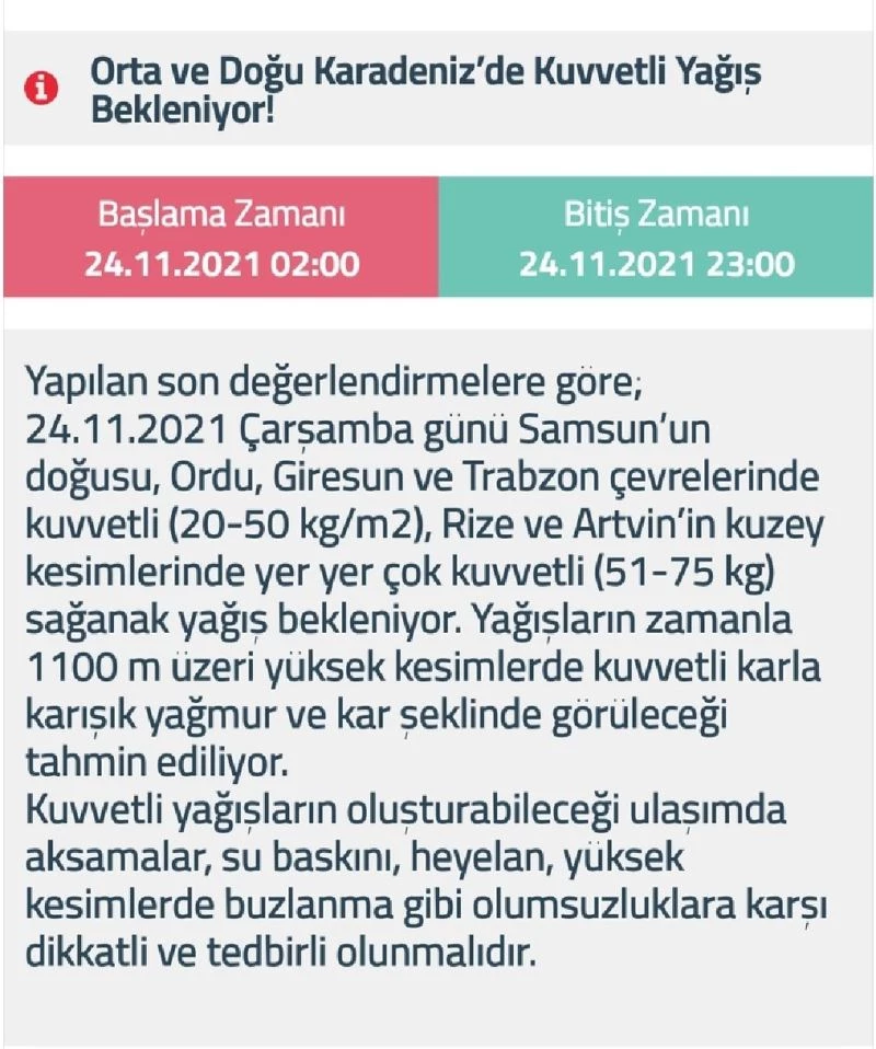 Samsun Valiliği konuyla ilgili yaptığı açıklamada ise, “Meteoroloji Genel Müdürlüğü’nün değerlendirmelerine göre, 24 Kasım Çarşamba günü Samsun’un doğu bölgelerinde kuvvetli yağış ve 1100 m üzeri yüksek kesimlerinde karla karışık yağmur ve kar yağışı beklendiğinden, muhtemel olumsuzluklara karşı dikkatli ve tedbirli olunmalıdır” denildi.