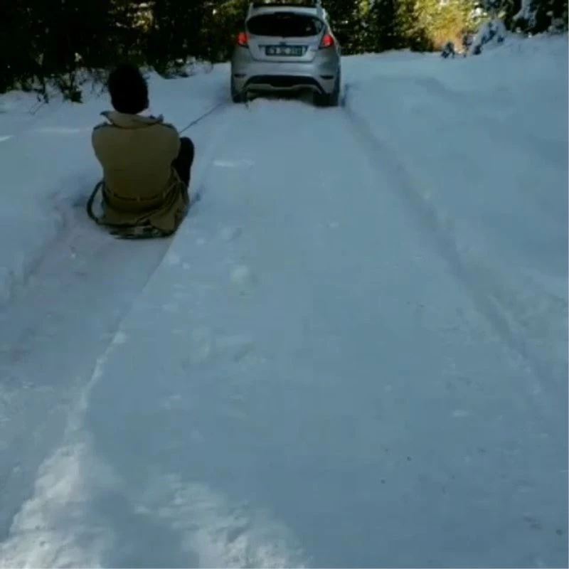 Karabük’ün Safranbolu ilçesinde bir grup vatandaş araçların arkasına bağladıkları kızakla kayarak karın keyfini çıkardı.