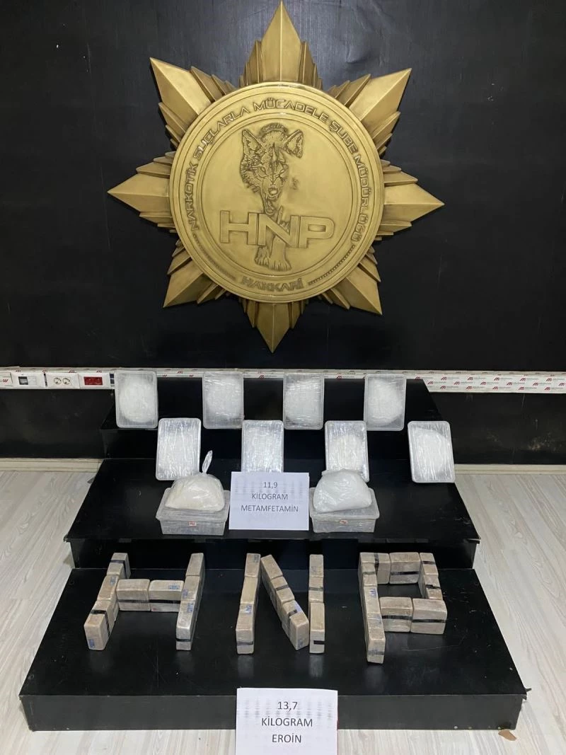 Hakkari Valiliğinden yapılan açıklamada, "İl Emniyet Müdürlüğü görevlilerimiz tarafından “Uyuşturucu veya Uyarıcı Madde İmal ve Ticareti” suçunu önlemeye yönelik olarak yürütülen çalışmalar kapsamında; 25 Ağustos 2021 günü Yüksekova ilçesinde tespiti yapılan bir araçta arama yapıldı. Yapılan aramada 13 kilo 700 gram eroin maddesi ile 11 kilo 900 gram metamfetamin maddesi ele geçirildi. Olay ile ilgili 1 şahıs yakalanarak gözaltına alınmış olup; adli tahkikat devam etmektedir" denildi.