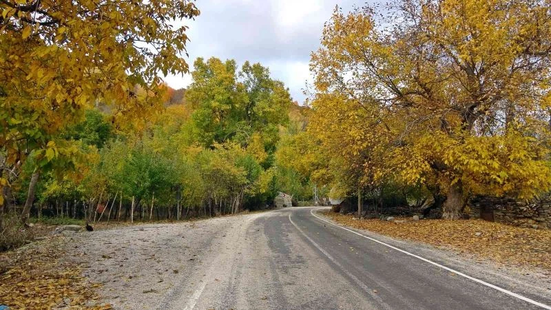 Hakkari’nin Yüksekova ilçesinde sonbaharla renk cümbüşüne bürünen ağaçların güzelliği mest ediyor.