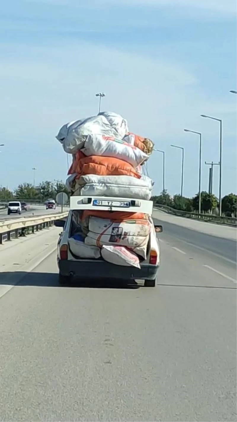 Adana’da otomobile aşırı yük yükleyip otoyolda seyreden sürücü görenleri şaşırttı.