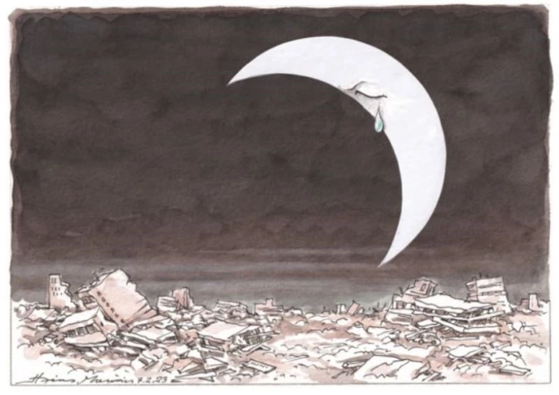 Yunan karikatürist Ilias Makris, Yunan gazetesi Kathimerini’de depreme desek çizimlerine devam ediyor. Makris’in gökyüzünde hilal biçimindeki ayın gözünden yıkılan binaların üzerine doğru bir damla yaş damlayan çizimi sosyal medyada gündem oldu.