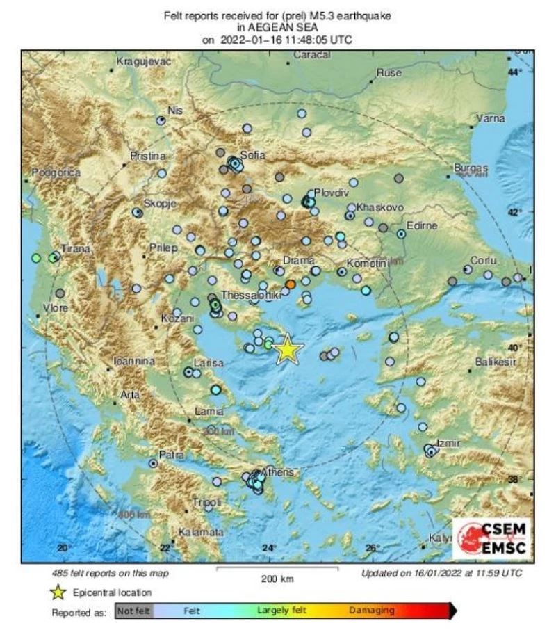 Avrupa Akdeniz Sismoloji Merkezi (EMSC) tarafından yapılan açıklamada, Yunanistan’ın Kavala kentinin 109 kilometre güneydoğusunda 5.3 büyüklüğünde deprem meydana geldiği belirtildi. Yerin 10 kilometre derinliğinde kaydedilen depremin ardından 3.9 şiddetinde artçı sarsıntı meydana geldiği bildirildi. Depremin ülkenin kuzey bölgelerinde hissedildiği ifade edildi.