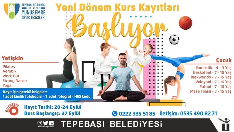 Tepebaşı Belediyesi’nin Şirintepe Mahallesi’nde hizmet veren Yunus Emre Spor Tesisleri’nde gerçekleştirilecek yeni dönem kursları başlıyor.
