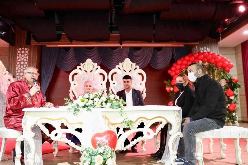 Yunusemre’de 11 çift evlenmek için 14 Şubat Sevgililer Günü’nü seçti. Özel günde çiftler için nikah salonu da süslendi.