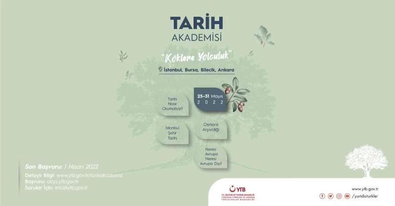 Yurtdışı Türkler ve Akraba Topluluklar Başkanlığı, yurt dışında yaşayan vatandaşlara yönelik “Tarih Akademisi” programı düzenliyor. Tarih alanına ilgi duyan lisans-lisansüstü eğitim gören öğrencilerin başvurabileceği program, 25 Mayıs-1 Haziran tarihleri arasında İstanbul, Bursa, Bilecik ve Ankara şehirlerinde yapılacak. Tarih Akademisi’nde tarihi mekânları yerinde gezip görme imkanı elde eden gençler, bu mekanların tarihi ve geçmişteki önemini anlatan seminerlere de katılacak. İstanbul’da başlayacak olan program, seminer ve gezilerin ardından Bursa ve Bilecik şehirleri ile devam edecek, Ankara’da son bulacak.
