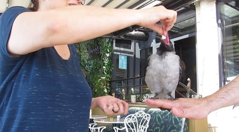 Yavru kargayı “Aşkım” diyerek elleriyle besleyen Hülya Doğan adlı müşteri de, “Gerçekten çok ilginç ve çok da güzel bir şey. Karga evcil bir hayvan değil ama burada gördüğüm kadarıyla herkes elleriyle beliyor. Çok muhteşem” ifadelerini kullandı.