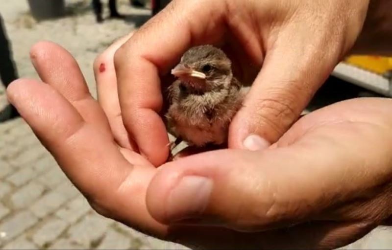 Yuvasından düşen yavru serçeyi itfaiye ekipleri kurtardı